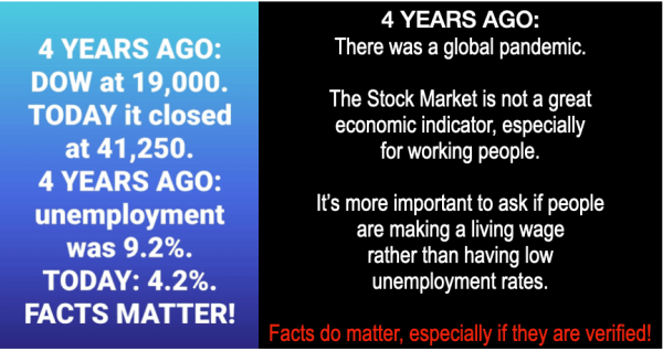 4 YEARS AGO: Dow at 19,000. Today it closed at 41,250. 4 YEARS AGO: unemployment was 9.2%. TODAY: 4.2%. FACTS MATTER!
