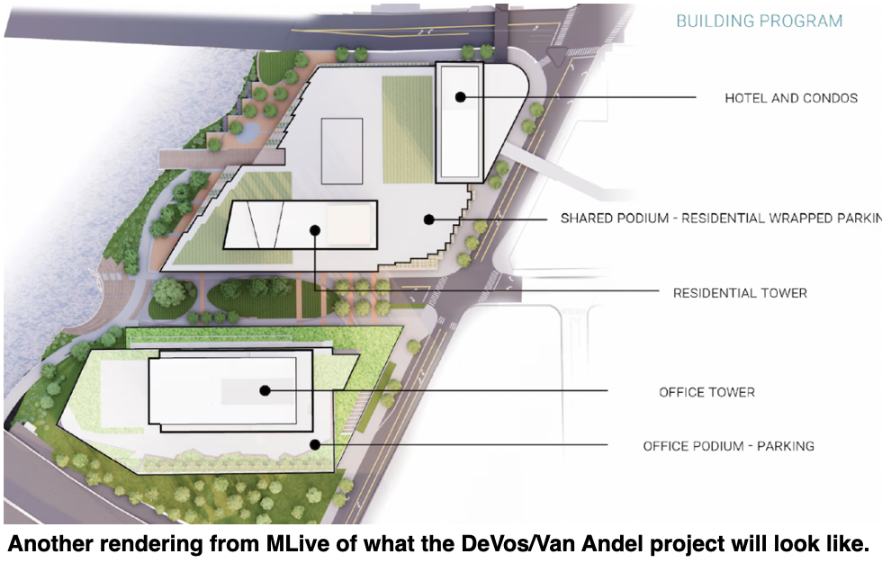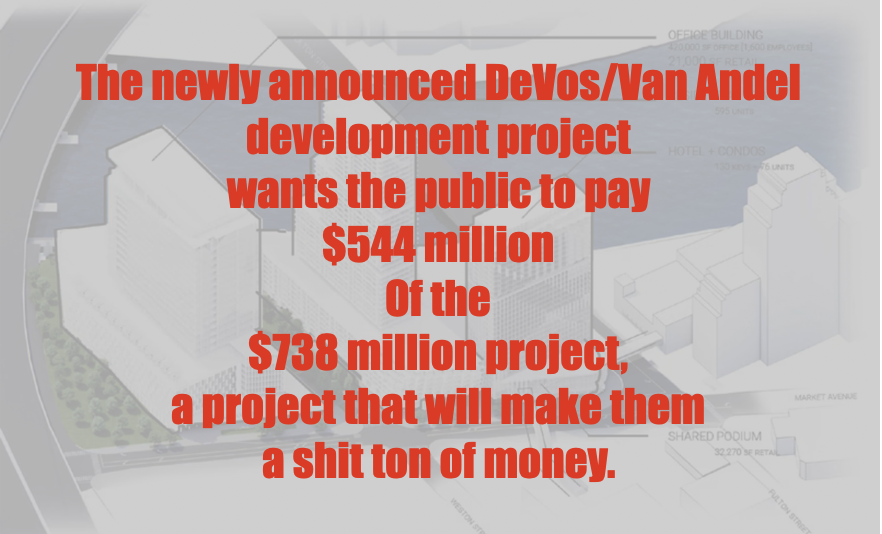 Ok, so just to be clear, the DeVos/Van Andel project will provide $8.5 million over a 20 year period to the Grand Rapids Affordable Housing Fund, and in return, the two billionaire families hope to get $544 million Transformational Brownfield plan (Public Money). Welcome to the world of NeoLiberal Capitalism, where the billionaire class will receive $544 million to develop a project that will make them countless millions over the years and we are supposed to be excited that some of the wealthiest families in the area will contribute $425,000 a year for 20 years to the City’s Affordable Housing Fund. $425,000 a year for the DeVos and Van Andel families is like most working class people contributing $50 a year. It’s chump change for these rich families.