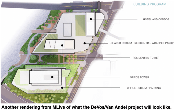 The MLive article states that the project’s price tag is an estimated $738 million, but the “developers are eyeing a big public subsidy — a $544 million Transformational Brownfield plan.” Thus, the two billionaire families are seeking to use public incentives to cover the cost of three quarters of the total development project costs.