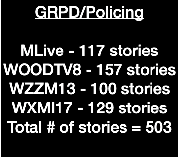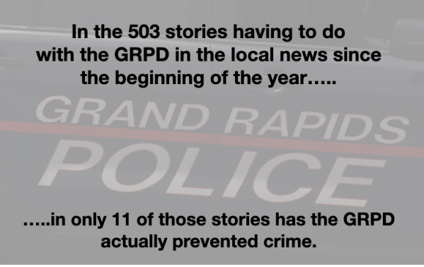 Third, the news media feeds into the fear narrative, which justifies large police departments. Since January 1st, I have been monitoring MLive, WOODTV8, WZZM 13 and WXMI 17 on a variety of issues. The number one new theme is crime, as you can see in the image here on the right. Comparatively, during the same time period, there have only been 72 stories about local elections. However, what is even more instructive is the fact that of the 503 news stories from the four news agencies, stories that center on public safety, there have only been 11 stories where the GRPD actually prevented a crime. If the GRPD is not actually preventing crime, then what the hell do they actually do?