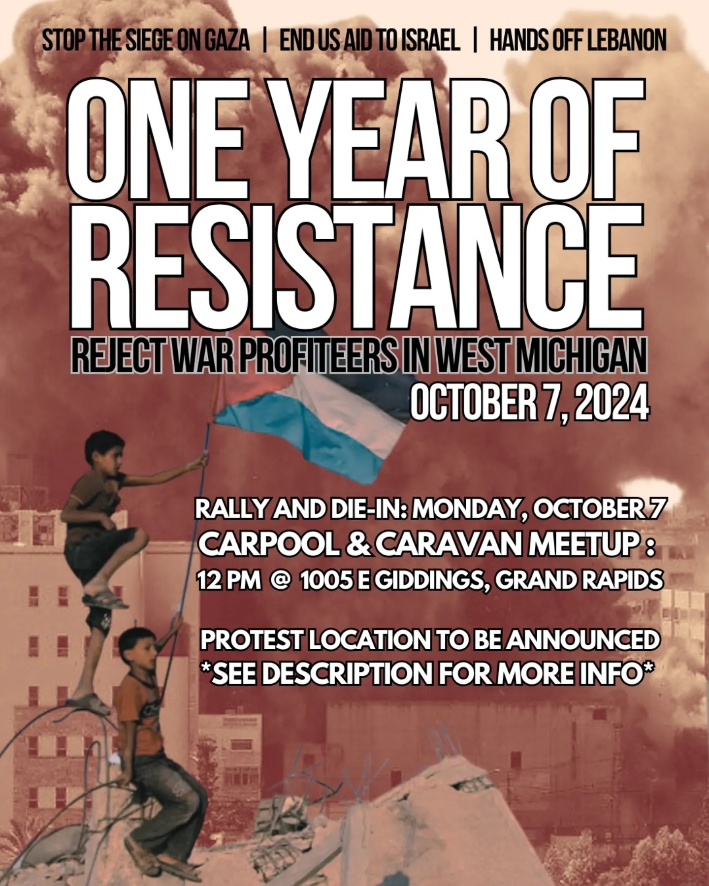 Monday, October 7: One year of genocide, one year of RESISTANCE! 12:00pm – arrive at meetup location, 1005 e Giddings Ave, Grand Rapids