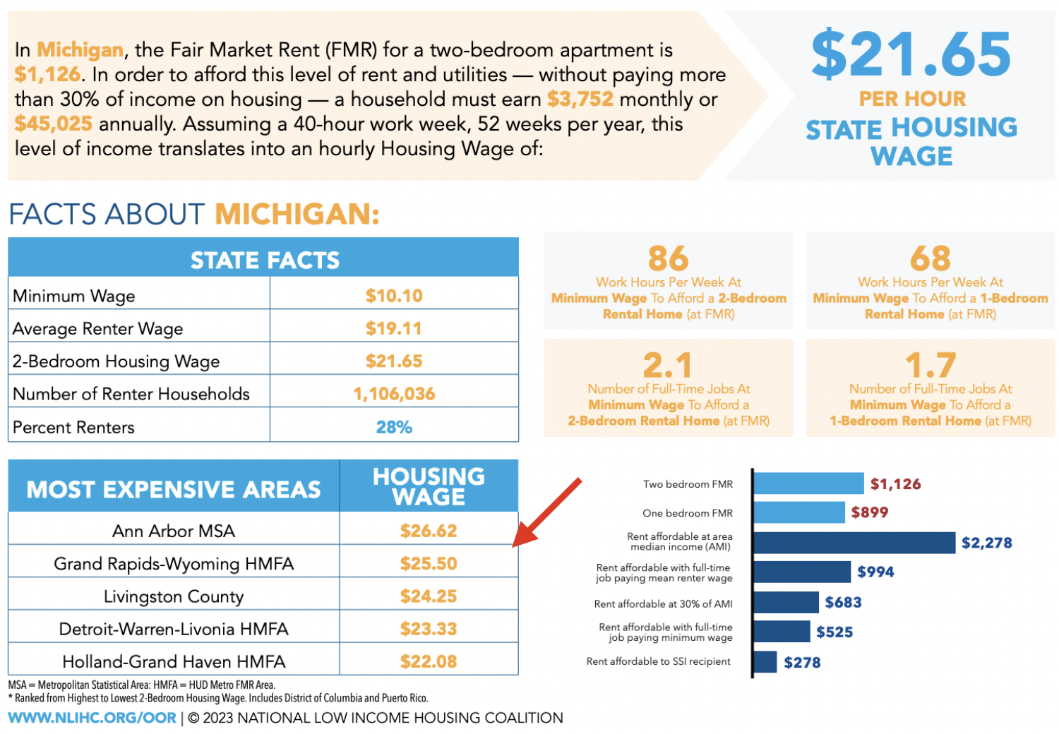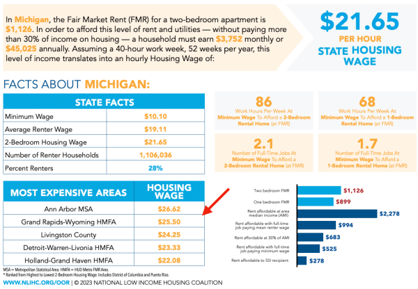 While the MLive article does provide some information on the cost of rent in Michigan and how Grand Rapids, Lansing and Detroit are in the top 20 of the most expensive in the country, the article fails to provide details on the actual cost of rent in each of these cities. MLive does cite the National Low Income Housing Coalition date for Michigan, but not for each of the three cities where the rent is too damn high. See above graphic.