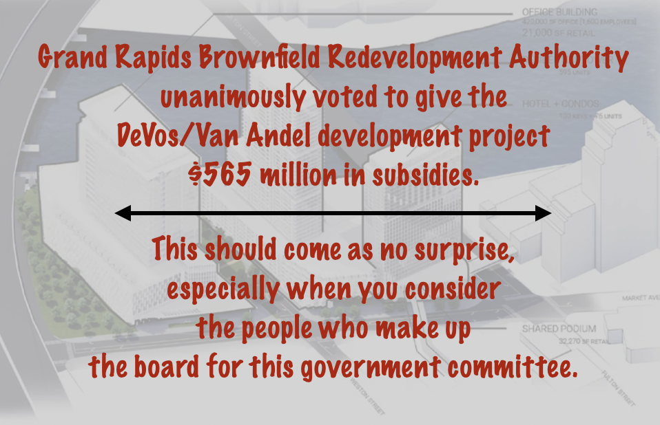 You can find the list of the 11 members board that makes up the Grand Rapids Brownfield Redevelopment Authority by going to this link. Besides including their name, I am including who these people work for, which should tell you something about why they unanimously approved the project and the $565 million subsidy.