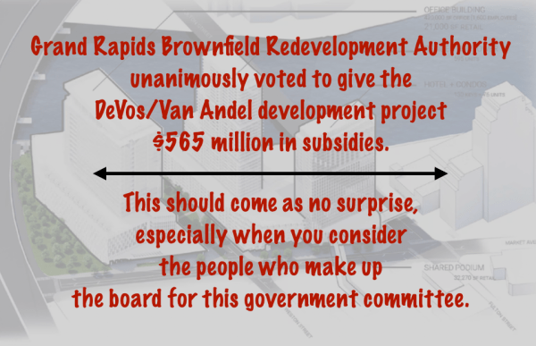 The announcement of the unanimous approval by the Grand Rapids Brownfield Redevelopment Authority to approve a $565 million subsidy to the two billionaire families wanting to build a massive development project in downtown Grand Rapids is not surprising at all. The MLive coverage of the announcement is also consistent with their previous coverage on this matter, which has been to simply provide a platform for the developing company to say whatever they want, without question.