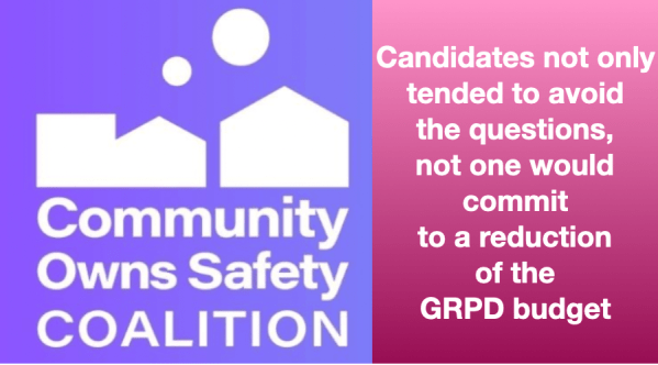 In the end, all four candidates ended up avoiding and addressing the three questions that were asked by Community Owns Safety Coalition members. Equally important was the fact that not one of them would publicly commit to reduce and redirect current GRPD funding to meet community needs, even though that was central to all three questions.