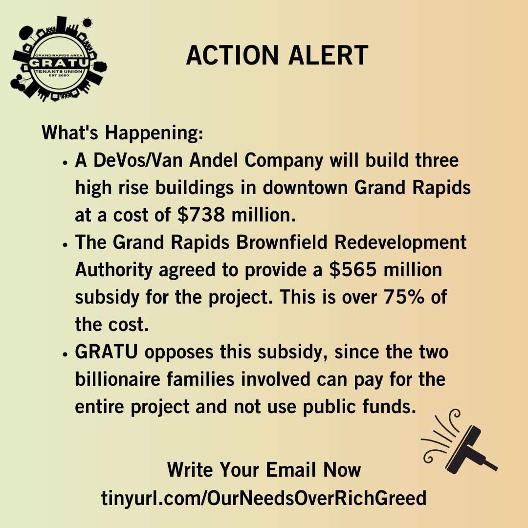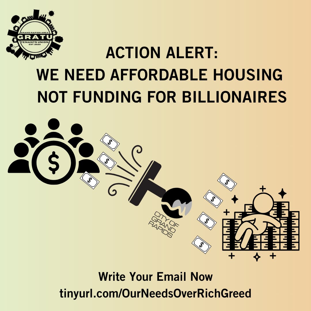 First, you can sign and share the Action Alert created by the Grand Rapids Area Tenant Union, an Action Alert that will go directly to the Mayor, the Grand Rapids City Commissioners and the Grand Rapids City Manager.