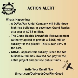 As I reported nearly three weeks ago, the Grand Rapids Brownfield Redevelopment Authority unanimously approved a $565 million subsidy to the DeVos/Van Andel development project. This $565 million subsidy to the two billionaire family development project needs to be opposed, and here are two things you can do: