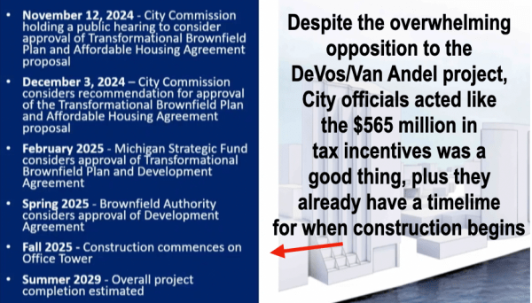Now, according to the timeline listed above, the Grand Rapids City Commission will vote on whether or not to approve the $565 million tax incentives to the DeVos/Van Andel development project on December 3rd. This does provide people with time to send the Action Alert created by the Grand Rapids Area Tenant Union, which emphatically opposes this $565 million give away. As of this writing there are close to 800 letters that have been sent to Grand Rapids City officials. We can make it over 1,000 by signing it and sharing it on social media.