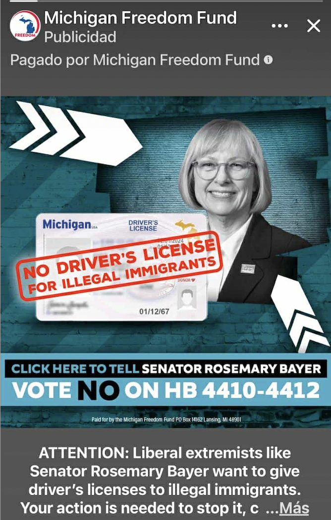 One example of a group opposing driver’s licenses for undocumented people is the DeVos-created, DeVos-funded organization known as the Michigan Freedom Fund. The Michigan Freedom Fund is essentially a GOP front group, which not only opposes undocumented people from having driver’s licenses, they have been using racist, xenophobic and anti-immigrant language in action alerts they are sending out to people telling them to not vote for the Drive S.A.F.E. bills. On the right is an action alert that the Michigan Freedom Fund has been sending out, where they specifically use xenophobic language, referring to undocumented immigrants as “illegal.”
