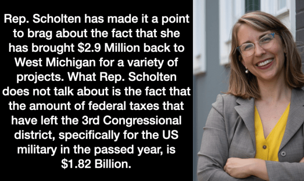 Rep. Scholten has made it a point to brag about the fact that she has brought $2.9 Million back to West Michigan for a variety of projects. What Rep. Scholten does not talk about, nor does she post this on her Facebook page, is the fact that the amount of federal taxes that have left the 3rd Congressional district, specifically for the US military, is $1.82 Billion.