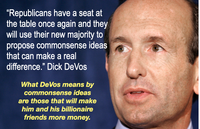 In a post from November 11th, Dick DeVos wrote an article entitled, Republican House majority means good things for Michigan. What I want to do is provide a little deconstruction of the article and correct some of the misinformation in the DeVos’ post.