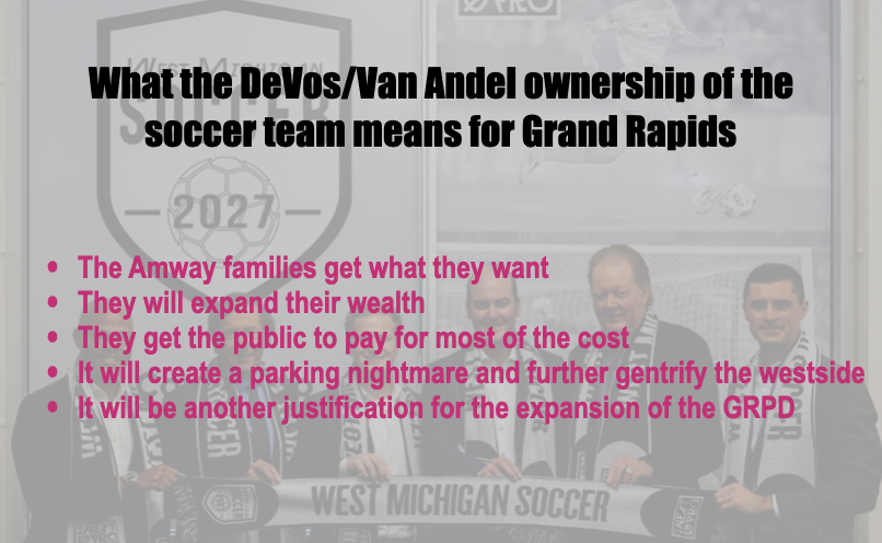 Third, of course the ultimate goal of the DeVos and Van Andel families is to expand their wealth. By owning another sports team, they will get to hold the City and County hostage in the future, when the time comes to expand the soccer stadium or use more land for parking, etc. The DeVos family owns most of the hotels in downtown GR, so when people come to watch a game and don’t want to drive home, or because they are from out of town, the chances are high that they will stay in a DeVos-owned hotel.