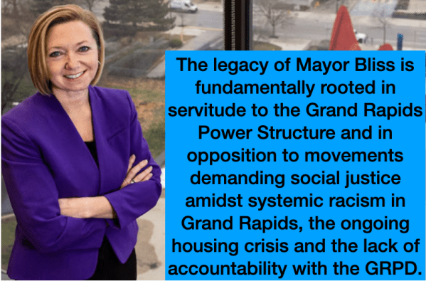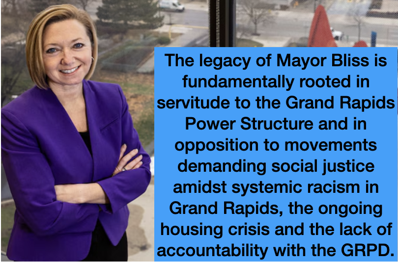 This is just a partial list of the ways in which Mayor Bliss has opposed efforts to promote justice, especially efforts that were led by BIPOC organizers. The legacy of Mayor Bliss is fundamentally rooted in servitude to the Grand Rapids Power Structure and in opposition to movements demanding social justice amidst systemic racism in Grand Rapids, the ongoing housing crisis and the lack of accountability with the GRPD.