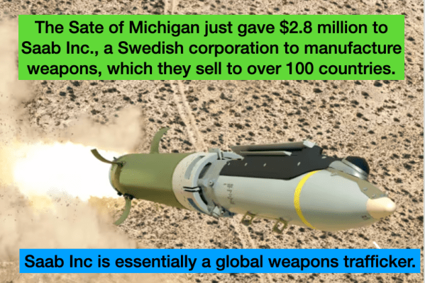 According to the MLive article, Saab Inc. will assemble ground-launched bomb systems and shoulder-launched munitions for the U.S. Department of Defense. The rest of the article talked mostly about land use and land sales to Saab Inc., but didn’t explore any other angles related to the use of public money for a privately owned weapons corporation.