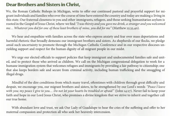 No where in this statement from the Michigan Catholic Conference is there a sense of urgency or any concrete commitment to actively support immigrant families. More importantly, there is nothing in the state that would communicate to immigrant families that the Catholic Church would actively resist the threat of mass deportation by engaging in such practices as offering Sanctuary to those who are being terrorized with the threat of mass deportation.