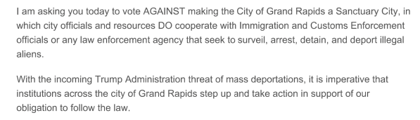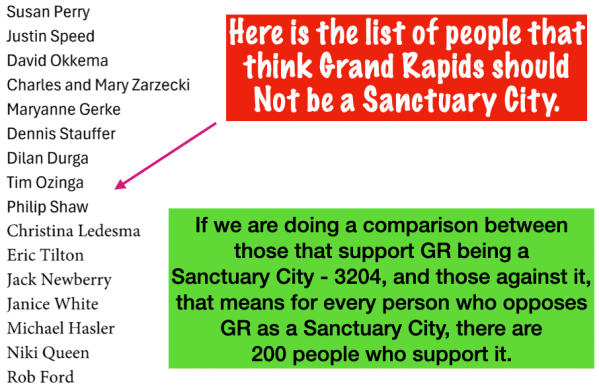In the graphic near the top of this article, you can see the list of names that signed the letter opposing Grand Rapids becoming a Sanctuary. It’s a 200-1 ratio of those in favor of GR being a Sanctuary City. The numbers don’t lie.