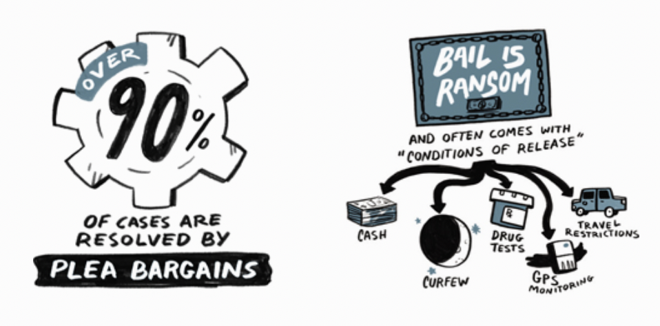 Chapter One provides a great introduction to the court system, with the chapter title being Criminal Courts 101. However, unlike most 101 bits of information, this book provided a more robust critique about the court system and why it is primarily used as a way to punish members of the working class and BIPOC communities. Chapter Two raised great questions about the court system, along with well researched analysis and great graphics & visuals, which acted as excellent popular education tools to communicate ideas, like graphic at the top.