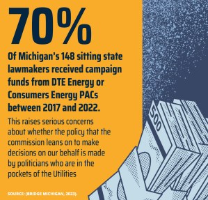 A second major points that was raised during the Press Conference, also from Cira-Reyes, was that of all 148 sitting state lawmakers, 102 received campaign funds from DTE Energy or Consumers Energy PACs between 2017 and 2022.” That’s almost 70% of all Michigan lawmakers taking money from the utilities during that time period. The campaign contributions from the utility companies raises serious concerns about whether the policy that the commission leans on to make decisions on our behalf is made by politicians who are in the pockets of the Utilities.