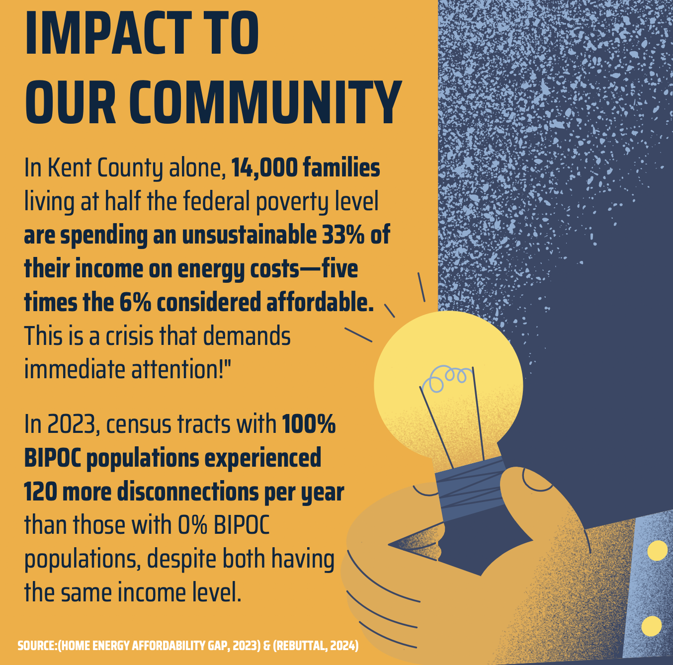 With the progress of climate change, an alarming crisis is growing as the percentage of income that families have to spend on energy surpasses the 6% allocation that is considered affordable. As recently as 2019, close to 14,000 Kent County families living at 50% of the federal poverty level, were spending 33% of their income on energy costs. Spending six percent of household income on energy costs is considered affordable, yet families are spending more than the 30% that they should be spending on housing alone. Since 2019, the Michigan Public Service Commission has approved a total of $274 million in six annual rate hike requests from Consumers Energy.