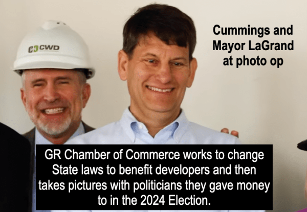 All three politicians that spoke, Mayor LaGrand, County Commissioner Greene and State Representative Hall, have all been funded by the Grand Rapids Chamber of Commerce. In the 2024 election cycle, LaGrand received $2000 from the GR Chamber, along with plenty of money from other GR Chamber members. Kent County Commissioner Ben Greene received $3500 from the GR Chamber, along with hefty amounts from members of the Grand Rapids Power Structure. State Rep. Matt Hall hasn’t received as much from the GR Chamber of Commerce, but he has received $43,550 from the MI Chamber of Commerce during his career as State Representative.
