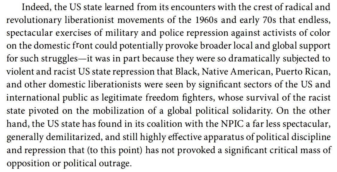 The first essay we discussed was a chapter from the book, The Revolution Will Not Be Funded, beginning on page 44, by Dylan Rodriguez. Rodriguez talks about carceral violence, using the FBI’s COINTELPRO campaign against radical groups in the 1960s and 70s. The essay then talks about what lessons the state learned during those decades and how they began to develop relationships with those in the non-profit sector and how the non-profit industrial complex came to play a larger (less violent) role in diminishing the impact or even the possibilities that people might take more radical actions to challenge systems of power and oppression.