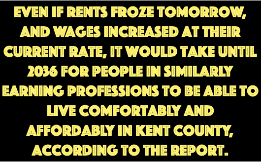 - Even if rents froze tomorrow, and wages increased at their current rate, it would take until 2036 for people in similarly earning professions to be able to live comfortably and affordably in Kent County, according to the report.