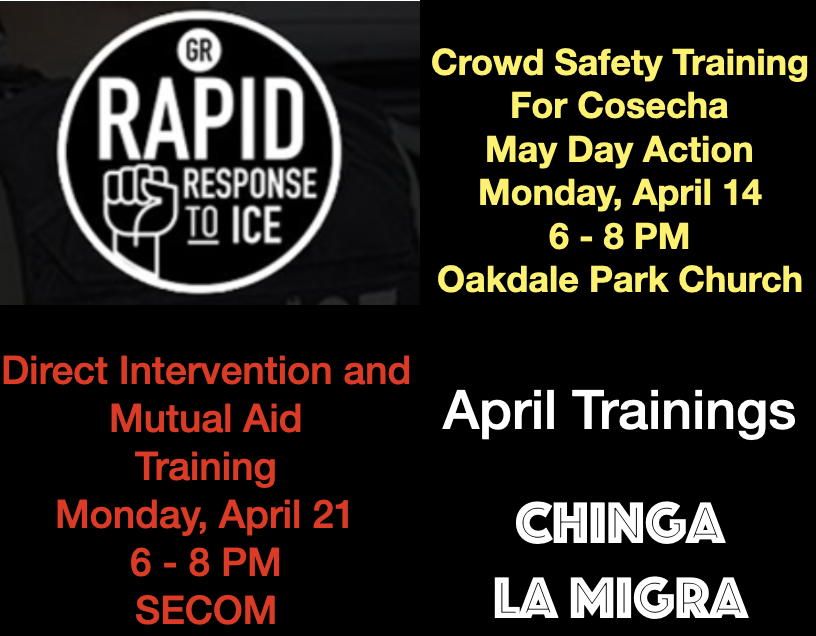 GR Rapid Response to ICE is hosting two events in April, in preparation for the Cosecha GR May Day actions. On Monday, April 14th, there will be a Crowd Safety Training from 6 – 8pm at Oakdale Park Church, located at 961 Temple St. SE in Grand Rapids, with details here. We need people to attend this training for Crowd Safety in order to have lots of people keep immigrants safe for the May 1 – May 4th actions that Cosecha GR has planned.