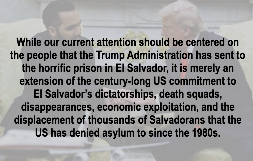 While our current attention should be centered on the people that the Trump Administration has sent to the horrific prison in El Salvador, we should also understand that these brutal human rights violations have always been central to the longstanding US military support of El Salvador’s oligarchy, to the murder and disappearances of tens of thousands of Salvadorans during the US financed counter-insurgency war, the US denial of asylum to thousands of Salvadorans fleeing political violence, the US-provided safe haven status for former Salvadoran military officials, and US economic policies like CAFTA that have forced forced to many Salvadorans to become immigrants. This brutality did not begin with the Trump Administration, it is merely an extension of the century-long US commitment to El Salvador’s dictatorships, which translates as US Imperialism.
