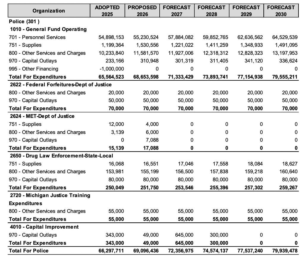 The City of Grand Rapids has submitted their 2026 Budget proposal, which includes $69,096,436.00 for the GRPD. You can see (above) how the amount for the GRPD will continue to grow and by 2030, they will receive nearly $80 million in public money to manage and control this community.