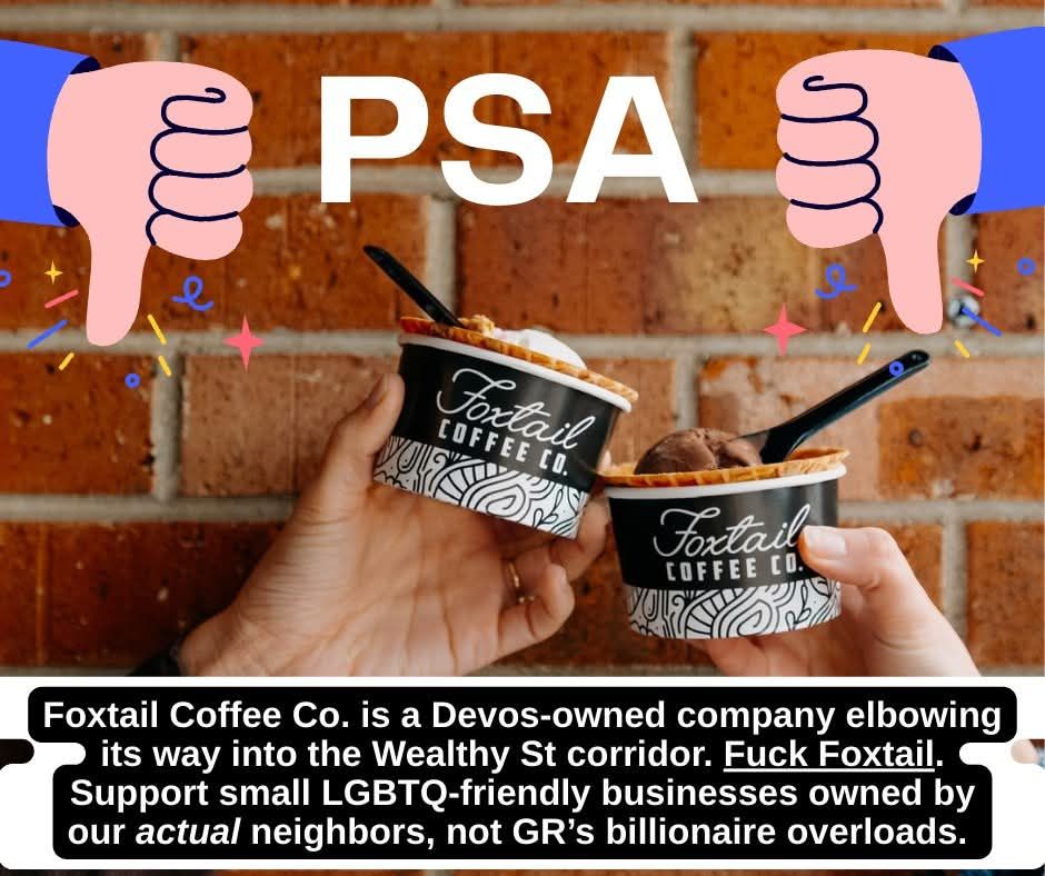 In our second example, there has been more uncritical news coverage of the new DeVos-owned coffee shop, known as the Foxtail Coffee Co. The MLive story does not mention that the cafe is owned by the DeVos family, only that it is part of the Baton Collective.