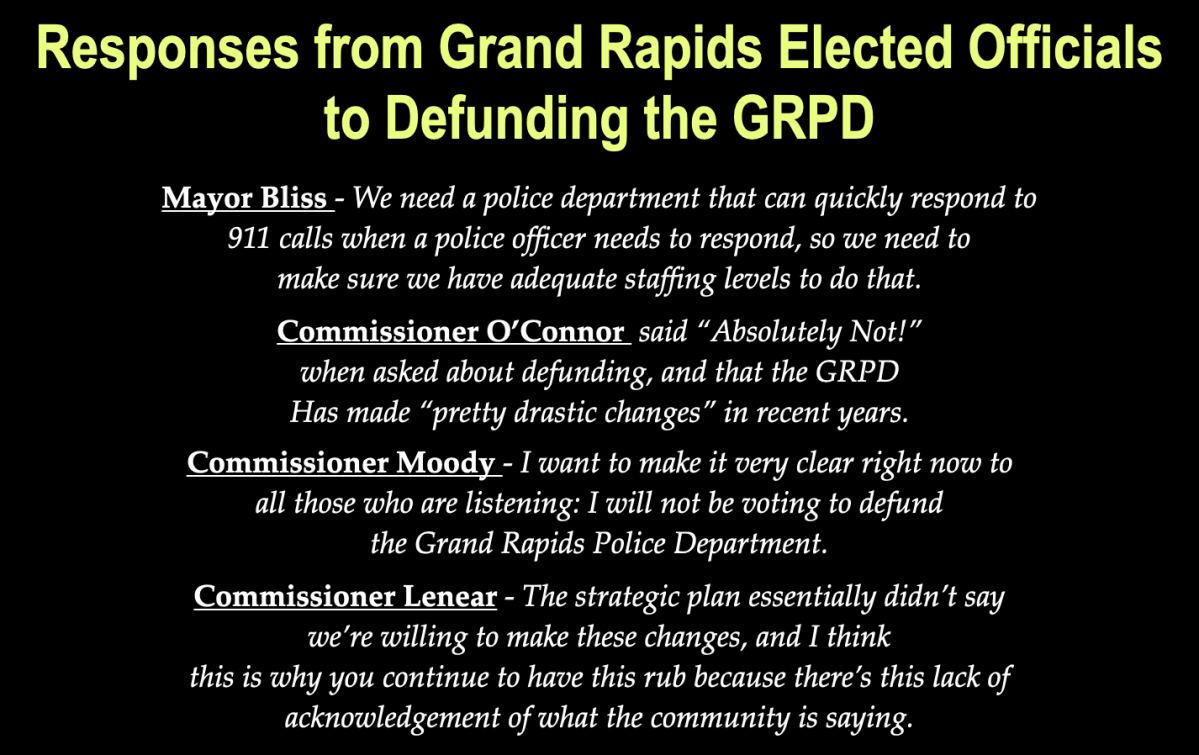 Defund the GRPD and Justice for Blacks did the bulk of the organizing for 2 years around challenging the GRPD and building capacity for defunding the Grand Rapids Police Department.