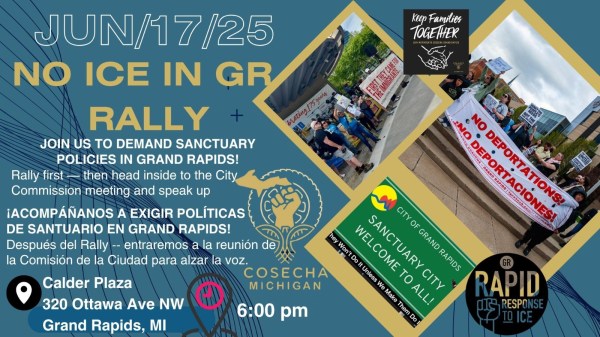 Third, to attend the ICE Out of GR rally that takes place at 6pm on Tuesday, June 17 at Calder Plaza. People will find out a whole ranges of ways they can resist ICE in Grand Rapids, as well as become involved in the campaigns that Movimiento Cosecha and GR Rapid Response to ICE have to get the City of Grand Rapids and Kent County to adopt sanctuary policies.