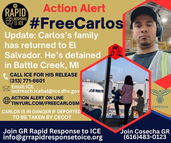 Second, Carlos Menjivar is still locked up in detention and we are still asking for people to sign the Action Alert to apply pressure to Senator Peters, Senator Slotkin and Rep. Scholten to meet the demands listed in the Action Alert.