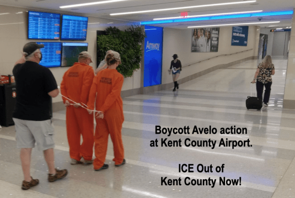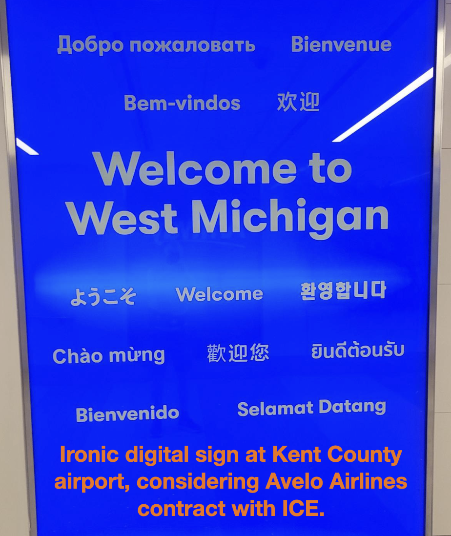 In March, it was announced that Avelo Airlines would be offering flights out of the Kent County Airport, with a few direct flights to North Carolina and Florida. GR Rapid Response to ICE began talking about organizing an action, but only if it would fit within the larger work to pressure Kent County to adopt a Sanctuary policy.