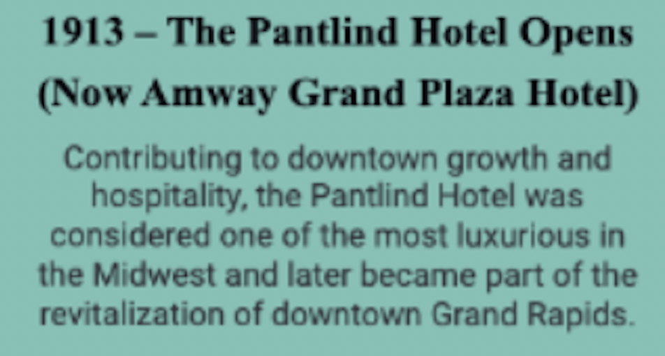1913 – The Pantlind Hotel Opens (Now Amway Grand Plaza Hotel) – The GR Chamber doesn’t acknowledge how this luxurious hotel was unaffordable for most Grand Rapidians in the early 20th Century. It is also interesting that the GR Chamber history mentions this same hotel twice in their timeline, while no other signal entity is mentioned more than once.