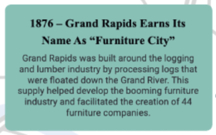 1876 – Grand Rapids Earns Its Name as “Furniture City” – Here the Chamber ignores the history of labor exploitation that happened in the Furniture industry. People should read Jeffrey Kleiman’s book, Strike: How the Furniture Workers Strike of 1911 Changed Grand Rapids, along with what the Grand Rapids People’s History Project has written about the topic.