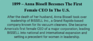 1899 – Anna Bissell Becomes The First Female CEO In The US – Again, the GR Chamber celebrates a female CEO, but offers no context. Anna, who was married to Melville Bissell, started as a sales
