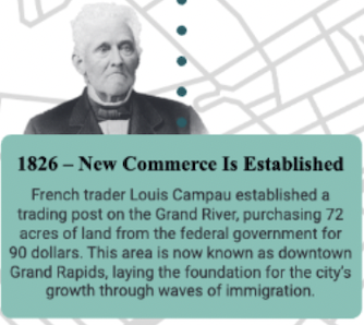 Pre 1880s – Grand River Valley – The GR Chamber of Commerce acknowledges that Indigenous people lived in this area before it became Grand Rapids, but they never mention how the Indigenous population was displaced, nor do they talk about the Settler Colonial history of the founding of Grand Rapids.