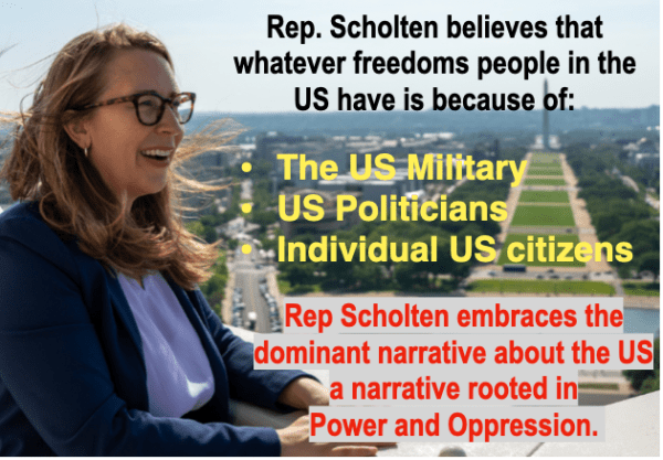 The point here is that organized people have won their rights, they have won their freedoms and their dignity, not because of the US military or US politicians. Social movements in the US have always been central to the expansion of freedoms and we should never confuse the US military or US politicians as being those that have made any of us free. Rep. Scholten once again demonstrates that she perpetuates the dominate narratives about US history. Scholten in no way can claim to be a progressive politician.