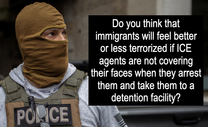 I understand the intention behind the proposed legislation, with ICE agents not providing transparency or to limit the number of fake-ICE agents from taking immigrants. However, what I find most problematic and most distributing about the VISIBLE Act is that it is not calling for the actual abolishment of ICE. Do you think that immigrants will feel better or less terrorized if ICE agents are not covering their faces when they arrest them and take them to a detention facility?