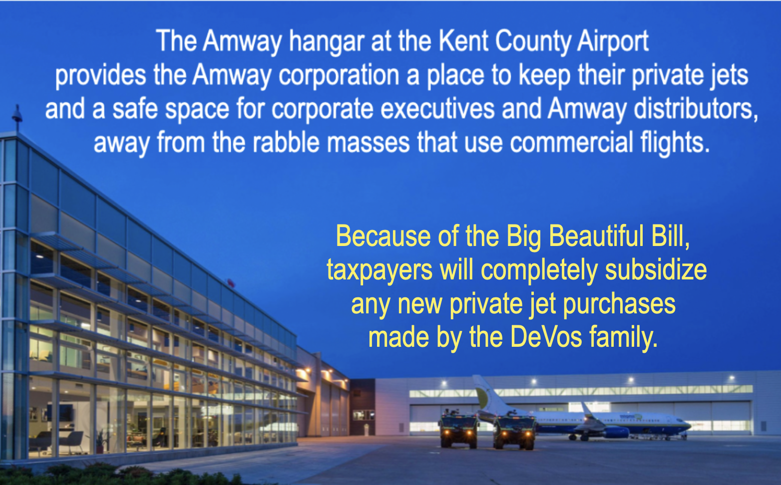 Then there is the fact that the global corporation that Rich DeVos founded with Jay Van Andel, the Amway Corporation, also has a fleet of private jets and other planes, with their own hangar at the Kent County Airport.