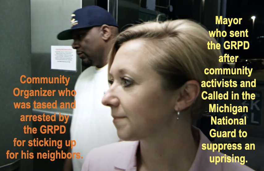 At first view it was refreshing to see so many BIPOC people, several that I knew, in this video, but there were also a few people in the video that I found troubling. There was former Grand Rapids Mayor Rosalynn Bliss in a scene in the video, where she is getting on an elevator with Victor Williams. The irony of this is that while Bliss was Mayor she presided over the 2020 uprising, numerous demands from the community for more police accountability and calls to defund the GRPD, which I have documented. What is even more ironic, was that just weeks ago, Victor Willams was tased by the GRPD, then arrested for questioning why the GRPD had stopped several Black youth at gunpoint.