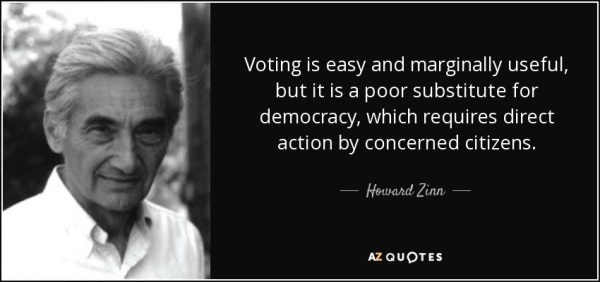 For those who continue to put their faith in electoral politics, I would argue, as does historian Howard Zinn, that the most effective means to address systemic oppression is by building radical social movements that are too powerful for politicians to ignore. From an Interview, Zinn said: