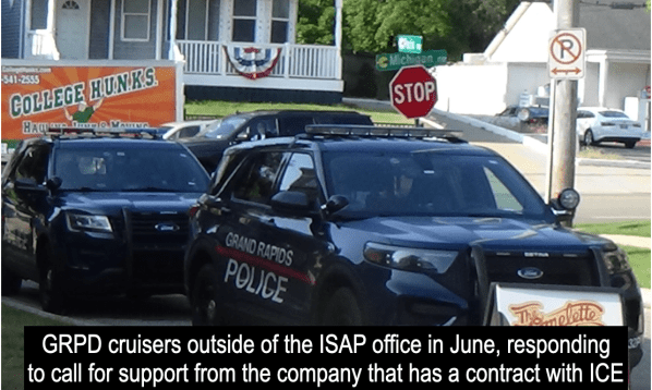 One last example of the GRPD cooperation with ICE, has been seen directly by GR Rapid Response to ICE since they started offering accompaniment to people who have appoints at the ISAP office, which is near downtown Grand Rapids. Those who are providing the accompaniment will ask those with appointments if they want them to go inside til that person enters the office. Whenever this happens, the company which manages the ISAP office and has a contract with ICE, calls the GRPD. The GRPD cops then intimidate and threaten to arrest anyone who even goes in the building.
