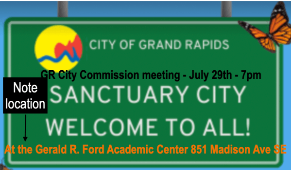 This coming Tuesday, July 29th, at 7pm, people have an opportunity come attend the Grand Rapids City Commission meeting to demand that they adopt the following 5 Sanctuary policies that Movimiento Cosecha and GR Rapid Response to ICE has laid out: