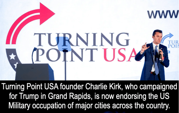Far right Trump cheerleader Charlie Kirk, who spoke in Grand Rapids in 2020, is also endorsing US military occupation of cities across the US