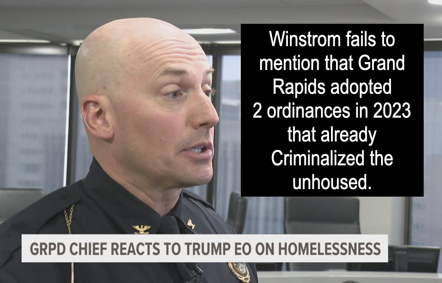 In late July, after President Trump issued an Executive Order that would further criminalize the unhoused, WZZM 13 ran a story about how Grand Rapids, and specifically GRPD Chief Winstrom, was responding to that Executive Order.