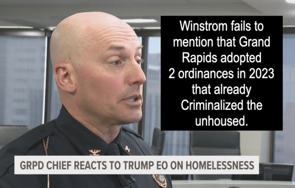Chief Winstrom thinks Grand Rapids is doing a pretty good job supporting the unhoused, but fails to mention the City ordinances that already criminalize the unhoused