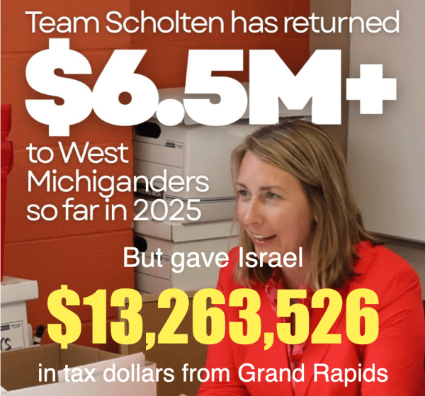 Rep. Hillary Scholten not only hides this information from us, she continues to vote for the annual trillion dollar US military budget and she continues to vote in favor of massive US weapons sales to Israel, while the Israeli military commits genocide in Gaza and starves the Palestinian families that live there. Imagine how the $13,263,526 that leaves Grand Rapids to fund Israel’s genocide could be used to benefit people living in this community.