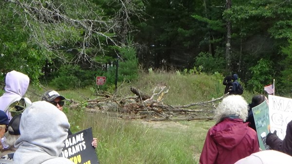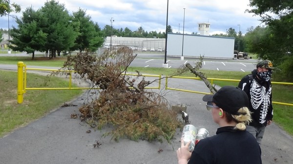 The only cops that people encountered were GEO Group security personnel that were driving around inside the prison compound in white trucks, where they were filming those protesting. At one point people heard that prison guards were using a different entrance to the ICE Detention facility, so people began to move to that area and deterring vehicles from entering. At one point people began dragging large tree branches and limbs to placing them in from the narrow entrance to the Baldwin facility, much to the delight of the crowd. One person I know said to me, “I’m so glad I stayed, since this is the first time I saw people engage in Direct Action,” referring to the makeshift blockade of the entrance.